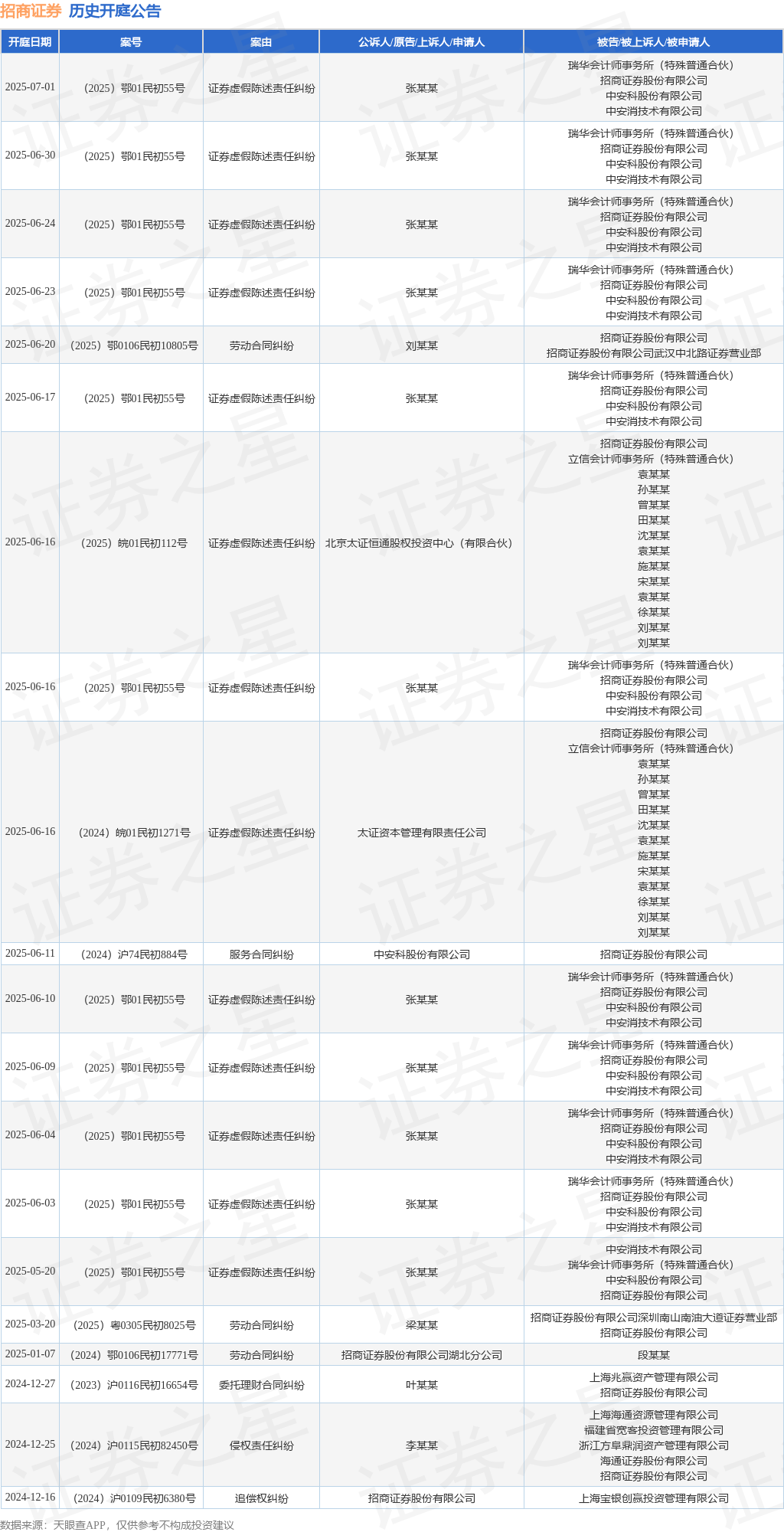 案号:(2025)鄂01民初55号审理法院:湖北省武汉市中级人民法院案由:证券虚假陈述责任纠纷当事人信息: 原告/上诉人:张某某 被告/被上诉人:瑞华会计师事务所(特殊普通合伙)、招商证券股份有限公司、中安科股份有限公司、中安消技术有限公司开庭日期:2025年6月17日根据统计,近一年内以招商证券股份有限公司为当事人的历史开庭公告有28则,其中案由为“证券虚假陈述责任纠纷”的公告以13则居首,其次为“劳动合同纠纷”有4则,“侵害商标权纠纷”有3则。历史开庭公告(前20条)如下: